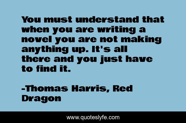 This page presents the quote "You must understand that when you are writing a novel you are not making anything up. It's all there and you just have to find it.". Author of this quote is Thomas Harris, Red Dragon. This quote is about on-writing, writing,.