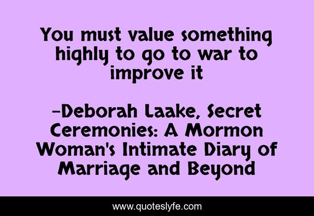 This page presents the quote "You must value something highly to go to war to improve it". Author of this quote is Deborah Laake, Secret Ceremonies: A Mormon Woman's Intimate Diary of Marriage and Beyond. This quote is about religion, biography, women,.