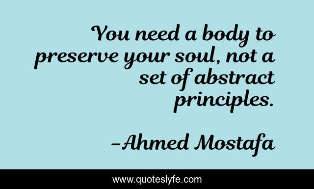 This page presents the quote "You need a body to preserve your soul, not a set of abstract principles.". Author of this quote is Ahmed Mostafa. This quote is about body, godlessness, atheist, abstract, principles, soul, atheism, delusions, body-and-mind,.