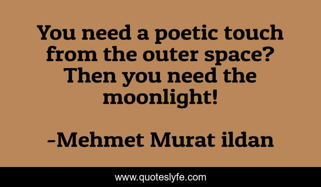 This page presents the quote "You need a poetic touch from the outer space? Then you need the moonlight!". Author of this quote is Mehmet Murat ildan. This quote is about turkish-aphorisms, moonlight, mehmet-murat-ildan, ildan-wise-sayings, space, ildan-wisdom, turkish-sayings, turkish, turkish-playwrights,.