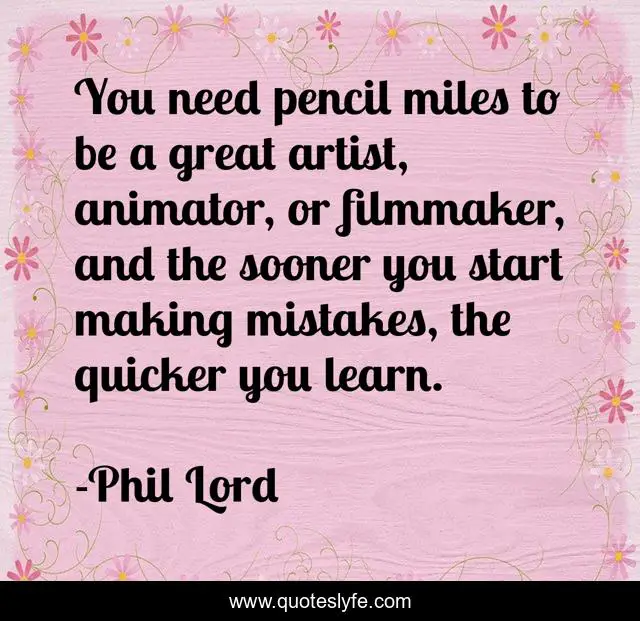 This page presents the quote "You need pencil miles to be a great artist, animator, or filmmaker, and the sooner you start making mistakes, the quicker you learn.". Author of this quote is Phil Lord. This quote is about mistakes, artist,.