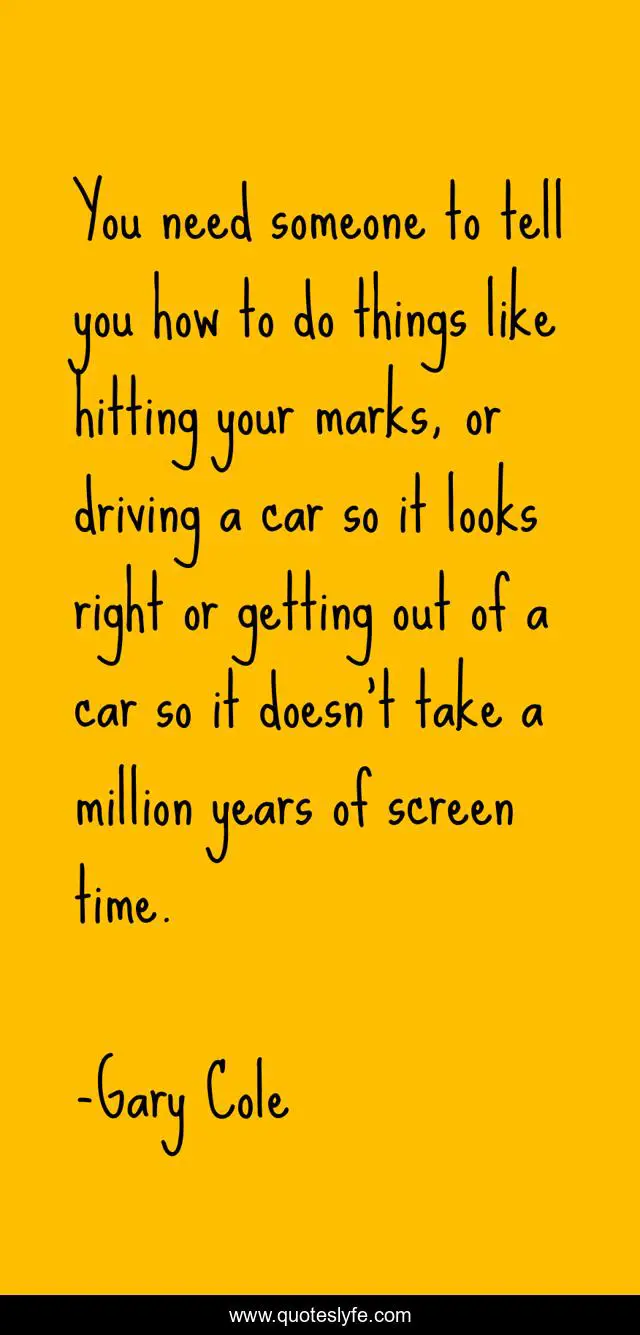 This page presents the quote "You need someone to tell you how to do things like hitting your marks, or driving a car so it looks right or getting out of a car so it doesn't take a million years of screen time.". Author of this quote is Gary Cole. This quote is about driving, time,.