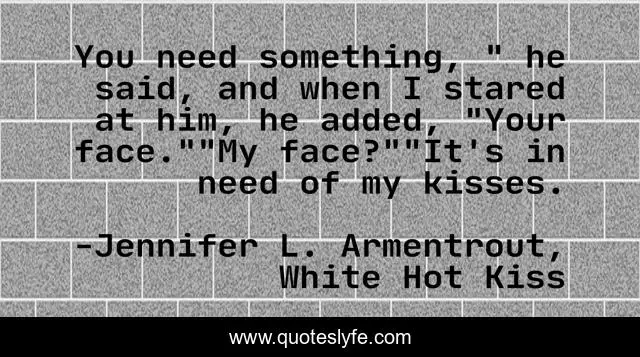This page presents the quote "You need something, " he said, and when I stared at him, he added, "Your face.""My face?""It's in need of my kisses.". Author of this quote is Jennifer L. Armentrout, White Hot Kiss. This quote is about need, kisses,.