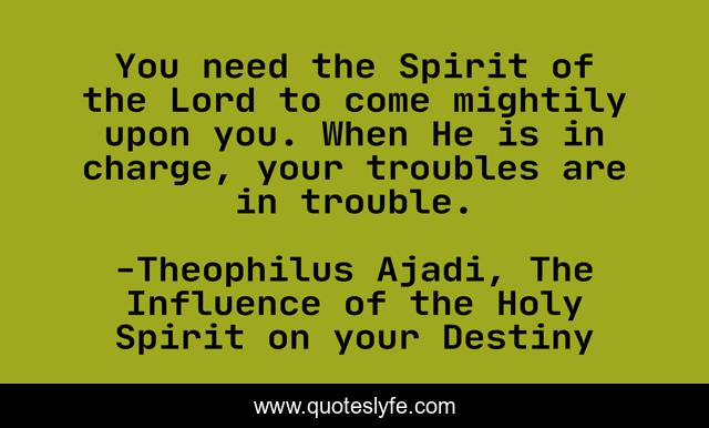 This page presents the quote "You need the Spirit of the Lord to come mightily upon you. When He is in charge, your troubles are in trouble.". Author of this quote is Theophilus Ajadi, The Influence of the Holy Spirit on your Destiny. This quote is about enthusiasm, holy-spirit, troubles, inspirational, spirit-of-god,.