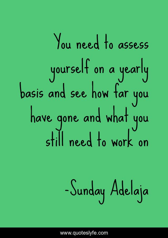 This page presents the quote "You need to assess yourself on a yearly basis and see how far you have gone and what you still need to work on". Author of this quote is Sunday Adelaja. This quote is about life, blessing, finance, money, employment, work, job, joblessness, purpose,.