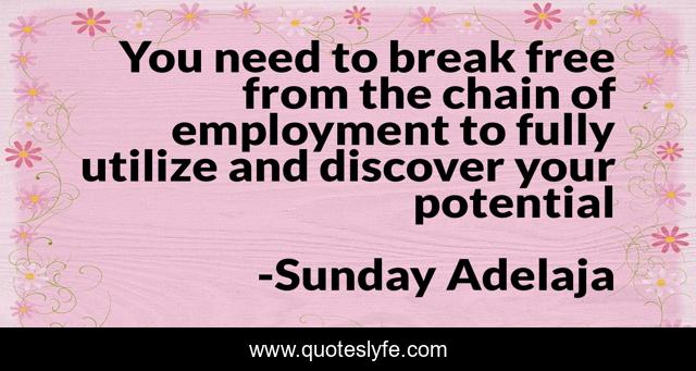 This page presents the quote "You need to break free from the chain of employment to fully utilize and discover your potential". Author of this quote is Sunday Adelaja. This quote is about life, discovering-potential, utilizing-potential, freedom, breaking-free, breaking-out, finance, job, purpose,.