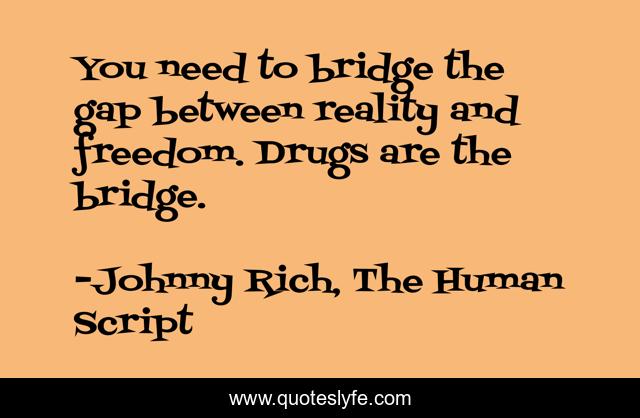 This page presents the quote "You need to bridge the gap between reality and freedom. Drugs are the bridge.". Author of this quote is Johnny Rich, The Human Script. This quote is about drugs, freedom, reality,.