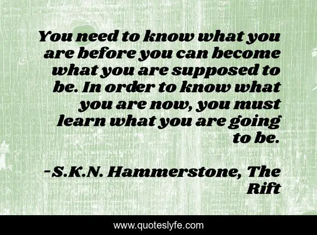 This page presents the quote "You need to know what you are before you can become what you are supposed to be. In order to know what you are now, you must learn what you are going to be.". Author of this quote is S.K.N. Hammerstone, The Rift. This quote is about angels-and-demons, death, skn-hammerstone, the-rift, demons, angels, vessel-of-souls,.