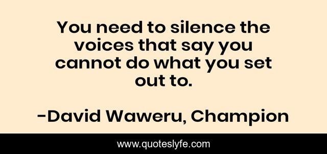 This page presents the quote "You need to silence the voices that say you cannot do what you set out to.". Author of this quote is David Waweru, Champion. This quote is about behaviour, enthusiasm, attitude, inspirational, can-do-spirit,.