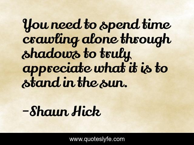 This page presents the quote "You need to spend time crawling alone through shadows to truly appreciate what it is to stand in the sun.". Author of this quote is Shaun Hick. This quote is about hard-times, bad-times, life, suicide, pain, darkness, cancer, sickness, sun,.