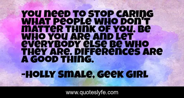 This page presents the quote "You need to stop caring what people who don't matter think of you. Be who you are and let everybody else be who they are. Differences are a good thing.". Author of this quote is Holly Smale, Geek Girl. This quote is about geek-girl, inspiration, personality,.