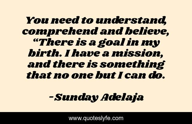 This page presents the quote "You need to understand, comprehend and believe, “There is a goal in my birth. I have a mission, and there is something that no one but I can do.". Author of this quote is Sunday Adelaja. This quote is about life, believe, goal, birth, mission, understanding, comprehension, truth, calling,.
