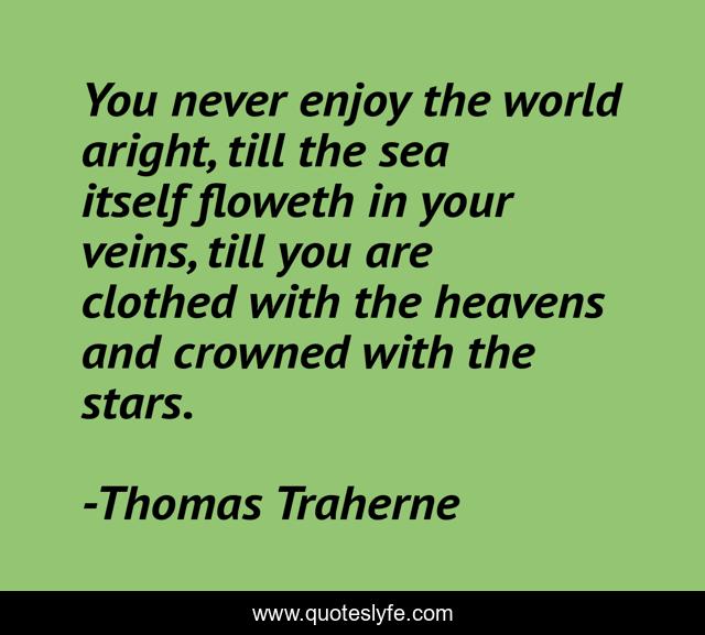 This page presents the quote "You never enjoy the world aright, till the sea itself floweth in your veins, till you are clothed with the heavens and crowned with the stars.". Author of this quote is Thomas Traherne. This quote is about world, stars, sea,.