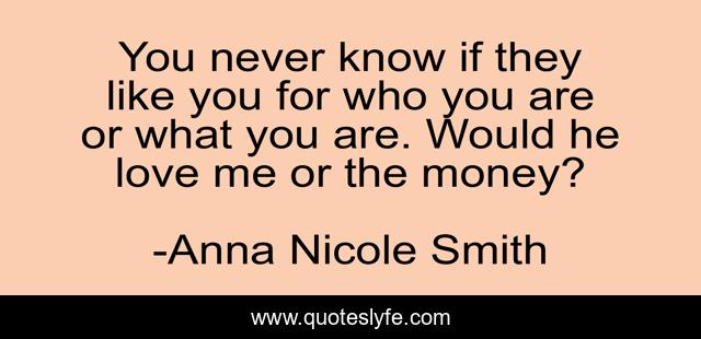 This page presents the quote "You never know if they like you for who you are or what you are. Would he love me or the money?". Author of this quote is Anna Nicole Smith. This quote is about me, love, affection,.