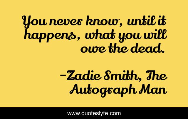 This page presents the quote "You never know, until it happens, what you will owe the dead.". Author of this quote is Zadie Smith, The Autograph Man. This quote is about death, dying, gesture,.