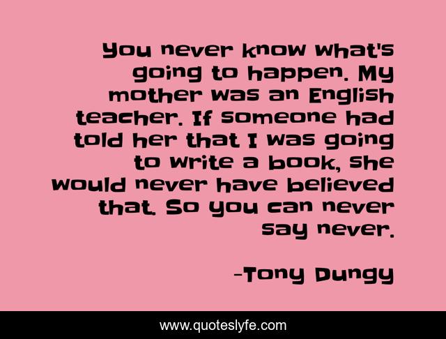 This page presents the quote "You never know what's going to happen. My mother was an English teacher. If someone had told her that I was going to write a book, she would never have believed that. So you can never say never.". Author of this quote is Tony Dungy. This quote is about book, mother,.