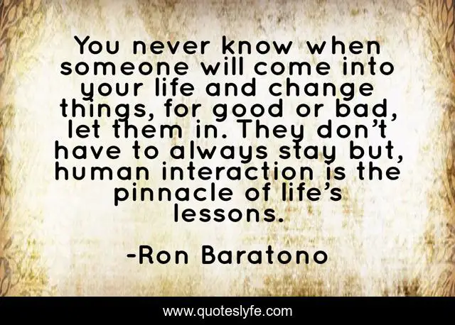 This page presents the quote "You never know when someone will come into your life and change things, for good or bad, let them in. They don’t have to always stay but, human interaction is the pinnacle of life’s lessons.". Author of this quote is Ron Baratono. This quote is about lessons, life, people,.