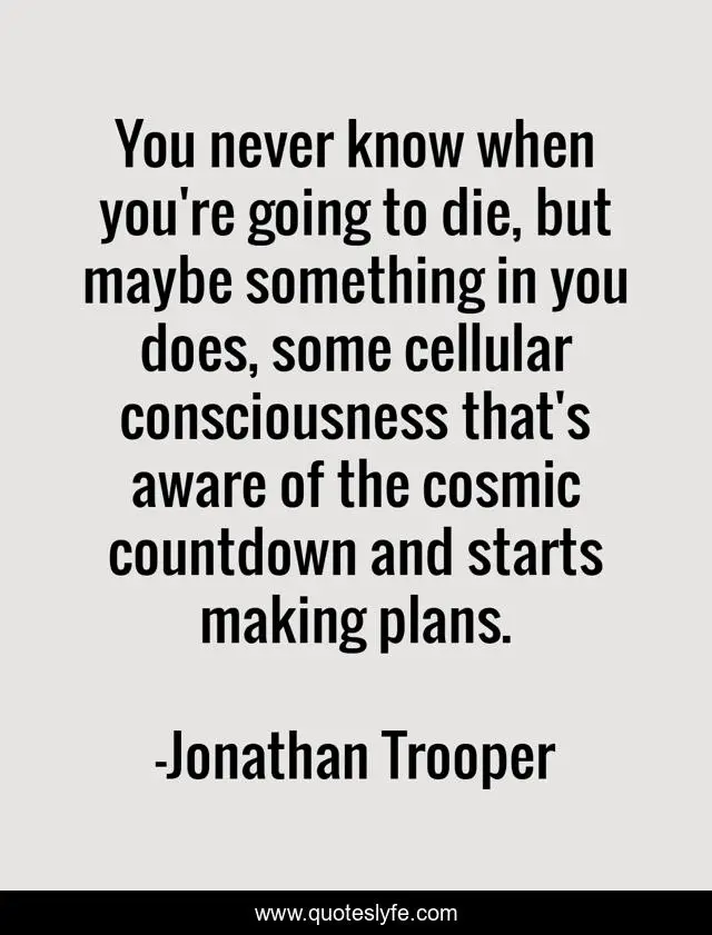 This page presents the quote "You never know when you're going to die, but maybe something in you does, some cellular consciousness that's aware of the cosmic countdown and starts making plans.". Author of this quote is Jonathan Trooper. This quote is about life, death-and-dying,.