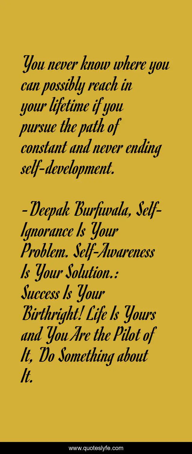 This page presents the quote "You never know where you can possibly reach in your lifetime if you pursue the path of constant and never ending self-development.". Author of this quote is Deepak Burfiwala, Self-Ignorance Is Your Problem. Self-Awareness Is Your Solution.: Success Is Your Birthright! Life Is Yours and You Are the Pilot of It, Do Something about It.. This quote is about self-education, success, leadership-development,.