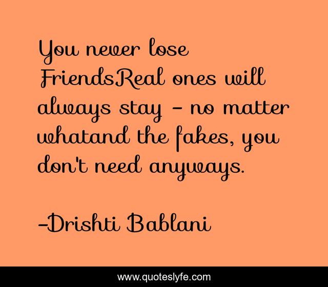This page presents the quote "You never lose Friends.Real ones will always stay - no matter whatand the fakes, you don't need anyways.". Author of this quote is Drishti Bablani. This quote is about friends, fake-friends, true-friends, wordions, wordions-com,.