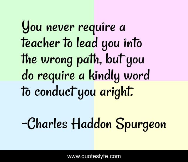 This page presents the quote "You never require a teacher to lead you into the wrong path, but you do require a kindly word to conduct you aright.". Author of this quote is Charles Haddon Spurgeon. This quote is about good-vs-evil, youth, guidance, leadership, morality,.