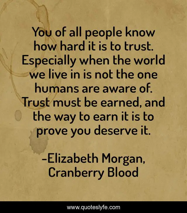 This page presents the quote "You of all people know how hard it is to trust. Especially when the world we live in is not the one humans are aware of. Trust must be earned, and the way to earn it is to prove you deserve it.". Author of this quote is Elizabeth Morgan, Cranberry Blood. This quote is about cranberry-blood, elizabeth-morgan, blood-series, urban-fantasy, romance, werewolves, vampire-slayers, psychics, vampires,.