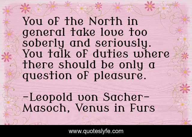 This page presents the quote "You of the North in general take love too soberly and seriously. You talk of duties where there should be only a question of pleasure.". Author of this quote is Leopold von Sacher-Masoch, Venus in Furs. This quote is about pleasure, love, affection, venus-in-furs,.