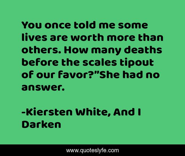 This page presents the quote "You once told me some lives are worth more than others. How many deaths before the scales tipout of our favor?”She had no answer.". Author of this quote is Kiersten White, And I Darken. This quote is about radu, death, worth,.