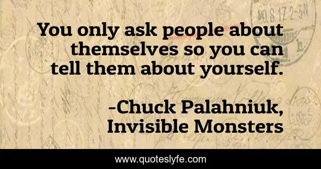 "Chuck Palahniuk, Invisible Monsters Quotes." Quoteslyfe.com, 2025. Fri. 05 Dec. 2025. <https://www.quoteslyfe.com/quote/You-only-ask-people-about-themselves-so-175067>.