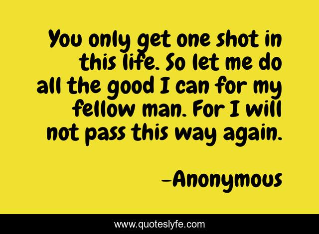 This page presents the quote "You only get one shot in this life. So let me do all the good I can for my fellow man. For I will not pass this way again.". Author of this quote is Anonymous. This quote is about caring, life, good, giving, inspirational, enthusiasm, kindness,.