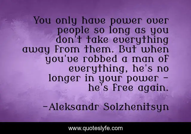This page presents the quote "You only have power over people so long as you don't take everything away from them. But when you've robbed a man of everything, he's no longer in your power - he's free again.". Author of this quote is Aleksandr Solzhenitsyn. This quote is about man, free, people,.