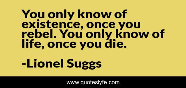 This page presents the quote "You only know of existence, once you rebel. You only know of life, once you die.". Author of this quote is Lionel Suggs. This quote is about living, existing,.