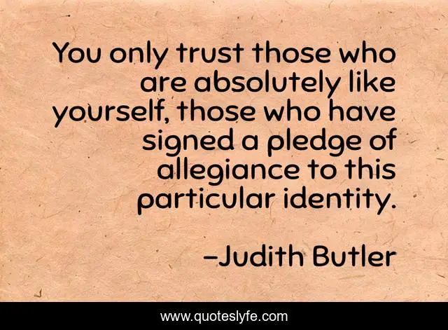 This page presents the quote "You only trust those who are absolutely like yourself, those who have signed a pledge of allegiance to this particular identity.". Author of this quote is Judith Butler. This quote is about identity, yourself,.