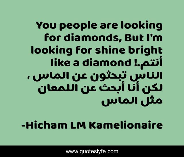 This page presents the quote "You people are looking for diamonds, But I'm looking for shine bright like a diamond !.أنتم الناس تبحثون عن الماس ، لكن أنا أبحث عن اللمعان مثل الماس". Author of this quote is Hicham LM Kamelionaire. This quote is about confidence, success-self-improvement, positive, motivational, optimistic, inspirational, enthusiasm,.