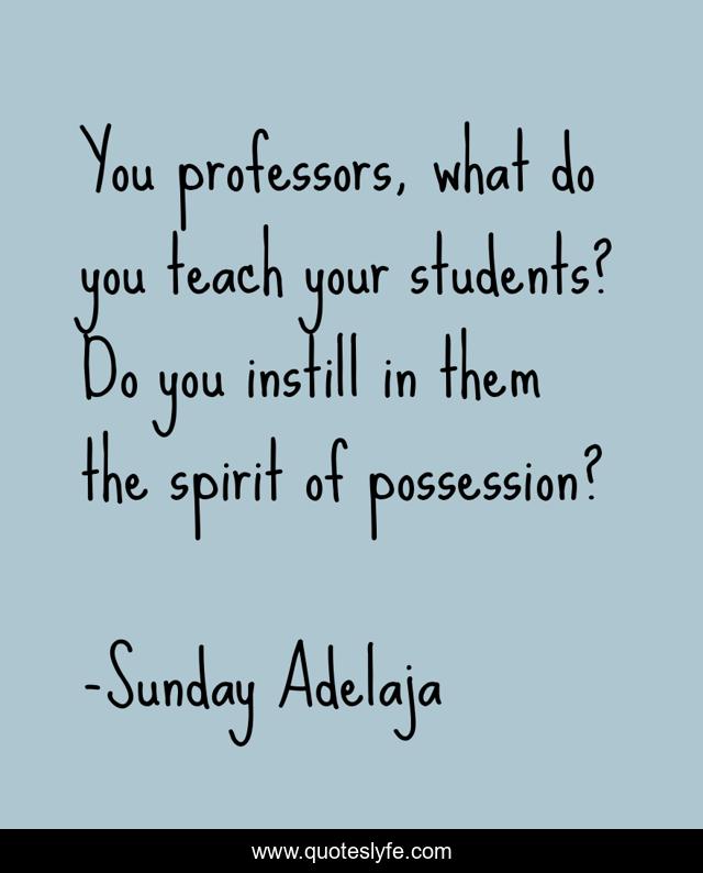 This page presents the quote "You professors, what do you teach your students? Do you instill in them the spirit of possession?". Author of this quote is Sunday Adelaja. This quote is about possession, them, students, spirit, professors, teach, your, instill,.