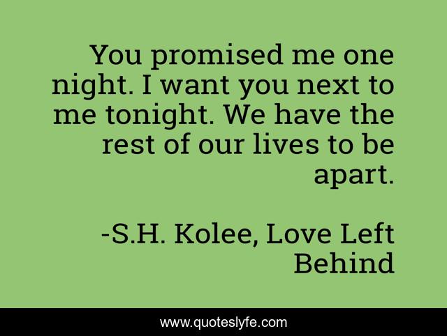 This page presents the quote "You promised me one night. I want you next to me tonight. We have the rest of our lives to be apart.". Author of this quote is S.H. Kolee, Love Left Behind. This quote is about heartache, lovers,.
