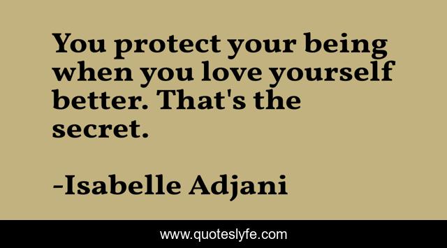 This page presents the quote "You protect your being when you love yourself better. That's the secret.". Author of this quote is Isabelle Adjani. This quote is about love yourself, yourself,.