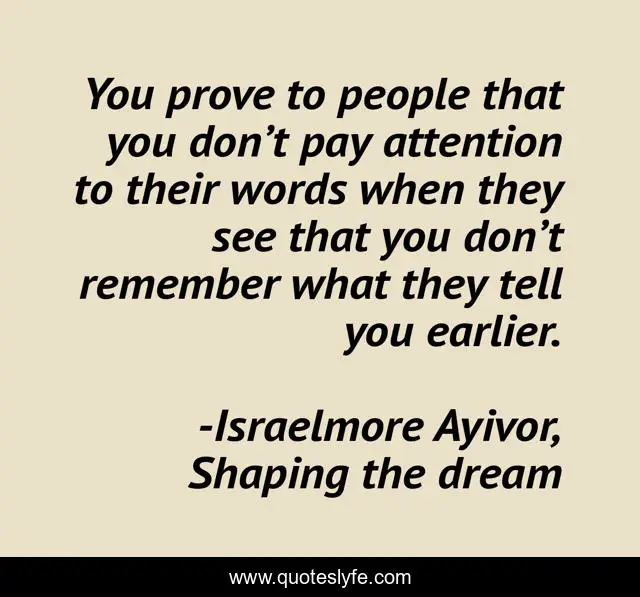 This page presents the quote "You prove to people that you don’t pay attention to their words when they see that you don’t remember what they tell you earlier.". Author of this quote is Israelmore Ayivor, Shaping the dream. This quote is about chats, food-for-thought, attention, remember, chatting, people, communication, prove, focus,.