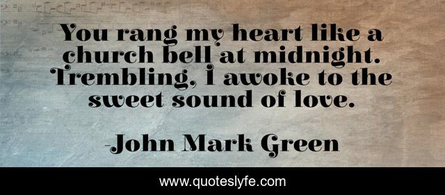 This page presents the quote "You rang my heart like a church bell at midnight. Trembling, I awoke to the sweet sound of love.". Author of this quote is John Mark Green. This quote is about relationships, heart, falling-in-love, love, romantic, bell, romance, affection,.