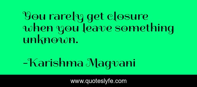 This page presents the quote "You rarely get closure when you leave something unknown.". Author of this quote is Karishma Magvani. This quote is about life, thatdream, every-dream-counts, try, just-do-it, dreams, achieve,.