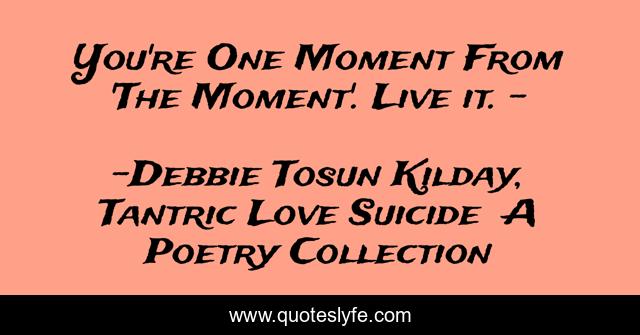 This page presents the quote "You're One Moment From 'The Moment'. Live it. -". Author of this quote is Debbie Tosun Kilday, Tantric Love Suicide A Poetry Collection. This quote is about quote, quotes, debbie-tosun-kilday, quotes-to-live-by,.