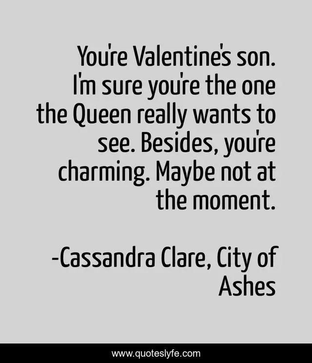 This page presents the quote "You're Valentine's son. I'm sure you're the one the Queen really wants to see. Besides, you're charming. Maybe not at the moment.". Author of this quote is Cassandra Clare, City of Ashes. .