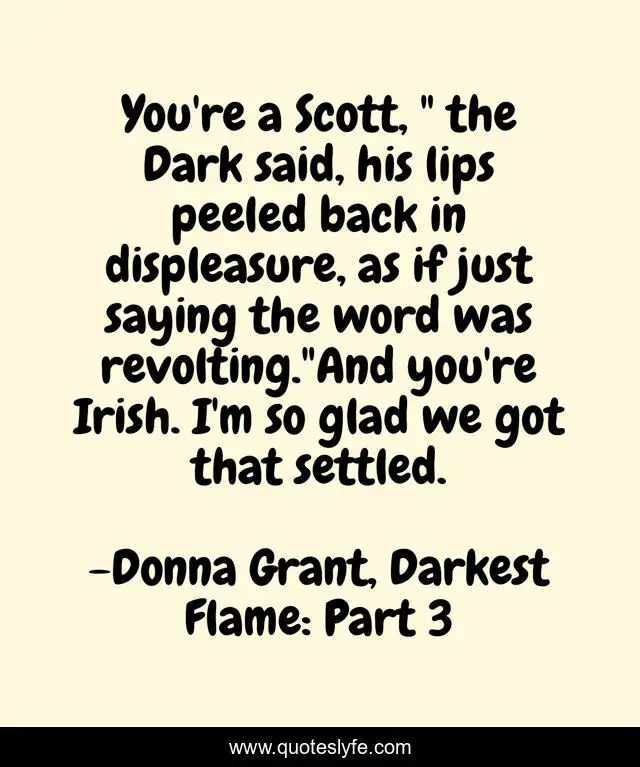 This page presents the quote "You're a Scott, " the Dark said, his lips peeled back in displeasure, as if just saying the word was revolting."And you're Irish. I'm so glad we got that settled.". Author of this quote is Donna Grant, Darkest Flame: Part 3. This quote is about irish, scotland-romance, paranormal, dragons, romance, dragon-shifters, dark-fae, fae,.