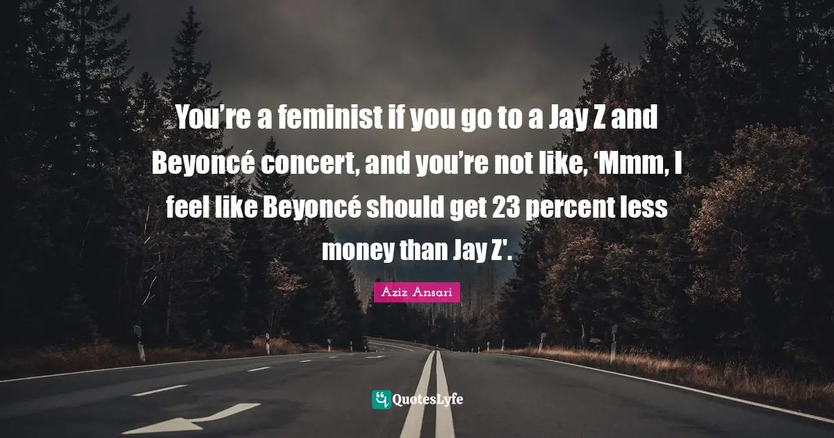 This page presents the quote "You’re a feminist if you go to a Jay Z and Beyoncé concert, and you’re not like, ‘Mmm, I feel like Beyoncé should get 23 percent less money than Jay Z'.". Author of this quote is Aziz Ansari. This quote is about concerts, feminist, percent, money,.
