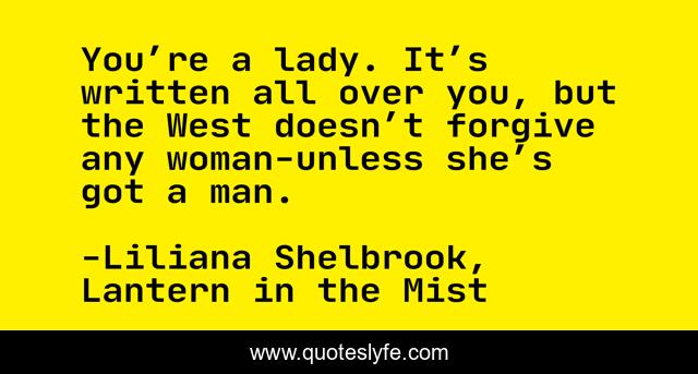 This page presents the quote "You’re a lady. It’s written all over you, but the West doesn’t forgive any woman-unless she’s got a man.". Author of this quote is Liliana Shelbrook, Lantern in the Mist. This quote is about strong-women, women-s-fiction, strong-female-characters, historical-fiction, western,.