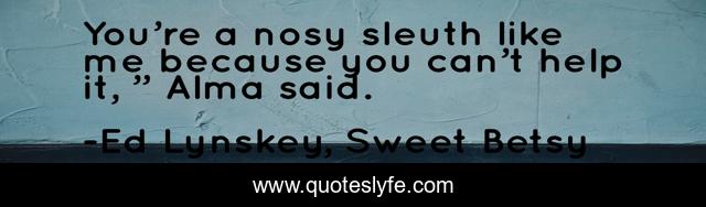 This page presents the quote "You’re a nosy sleuth like me because you can’t help it, ” Alma said.". Author of this quote is Ed Lynskey, Sweet Betsy. This quote is about humor, cozy-mystery, women-sleuths, cozy-mysteries, romance, mysteries-cozy, whodunit, cozies, cozy,.