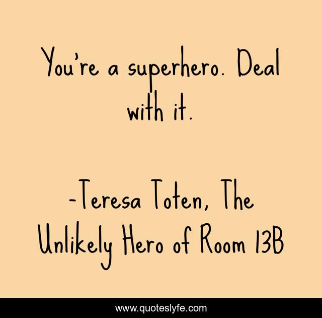 This page presents the quote "You're a superhero. Deal with it.". Author of this quote is Teresa Toten, The Unlikely Hero of Room 13B. This quote is about confidence, uplifting, positive, advice, inspirational, enthusiasm, potivity, hope,.