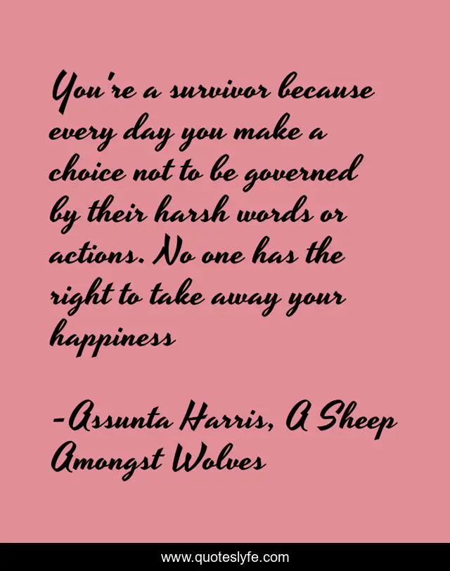 This page presents the quote "You're a survivor because every day you make a choice not to be governed by their harsh words or actions. No one has the right to take away your happiness". Author of this quote is Assunta Harris, A Sheep Amongst Wolves. This quote is about child-abuse, survivor, rape-survivor, bullying, survivors-of-abuse, abuse-recovery, inspirational, enthusiasm,.