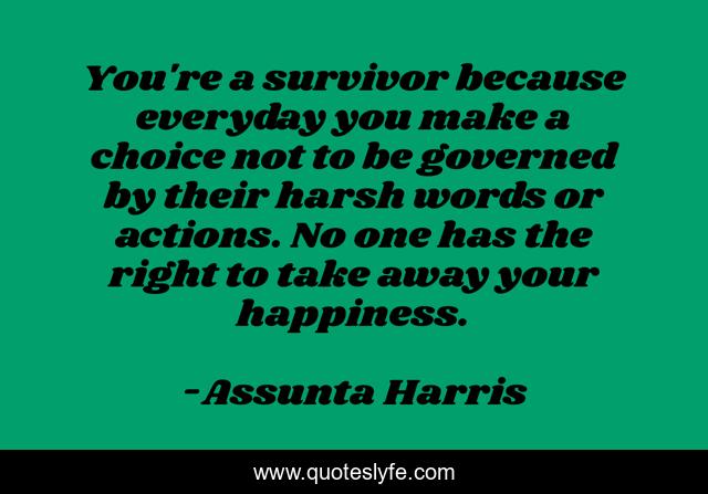 This page presents the quote "You're a survivor because everyday you make a choice not to be governed by their harsh words or actions. No one has the right to take away your happiness.". Author of this quote is Assunta Harris. This quote is about child-abuse, survivor, rape-survivor, bullying, survivors-of-abuse, abuse, inspirational, enthusiasm,.