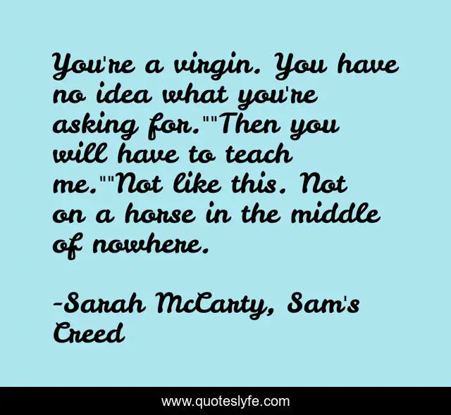 This page presents the quote "You're a virgin. You have no idea what you're asking for.""Then you will have to teach me.""Not like this. Not on a horse in the middle of nowhere.". Author of this quote is Sarah McCarty, Sam's Creed. This quote is about romance, sarah-mccarty, erotica-romance, historical-western,.